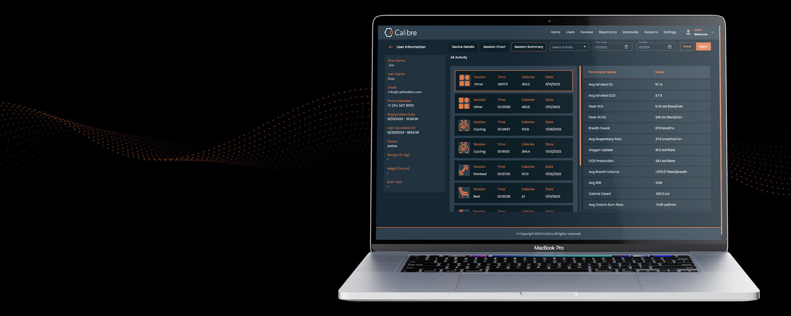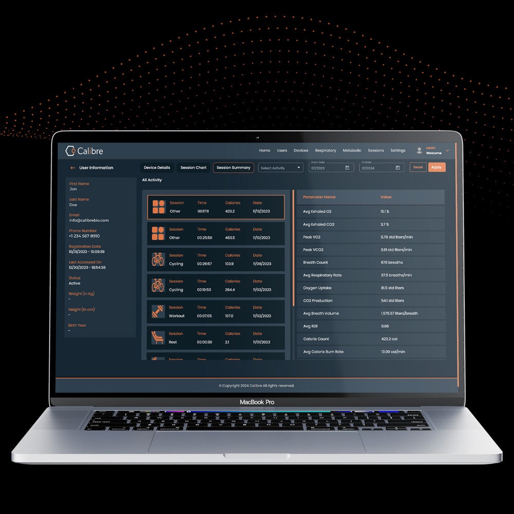 Using gold-standard indirect calorimetry, Calibre captures VO₂, VCO₂, breath volume, and respiratory rate to calculate: