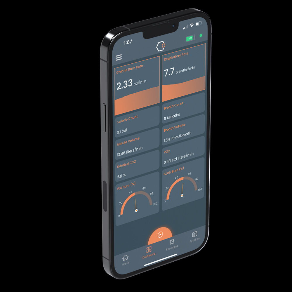 Measuring 50 times per second, Calibre™ reads and captures oxygen intake, carbon dioxide production, respiratory flow & volume, and more. Taking these measurements and complicated formulas, the Calibre™ app is then able to help determine a multitude of metrics like the calorie burn rate, %carb vs. %fat burned and more.